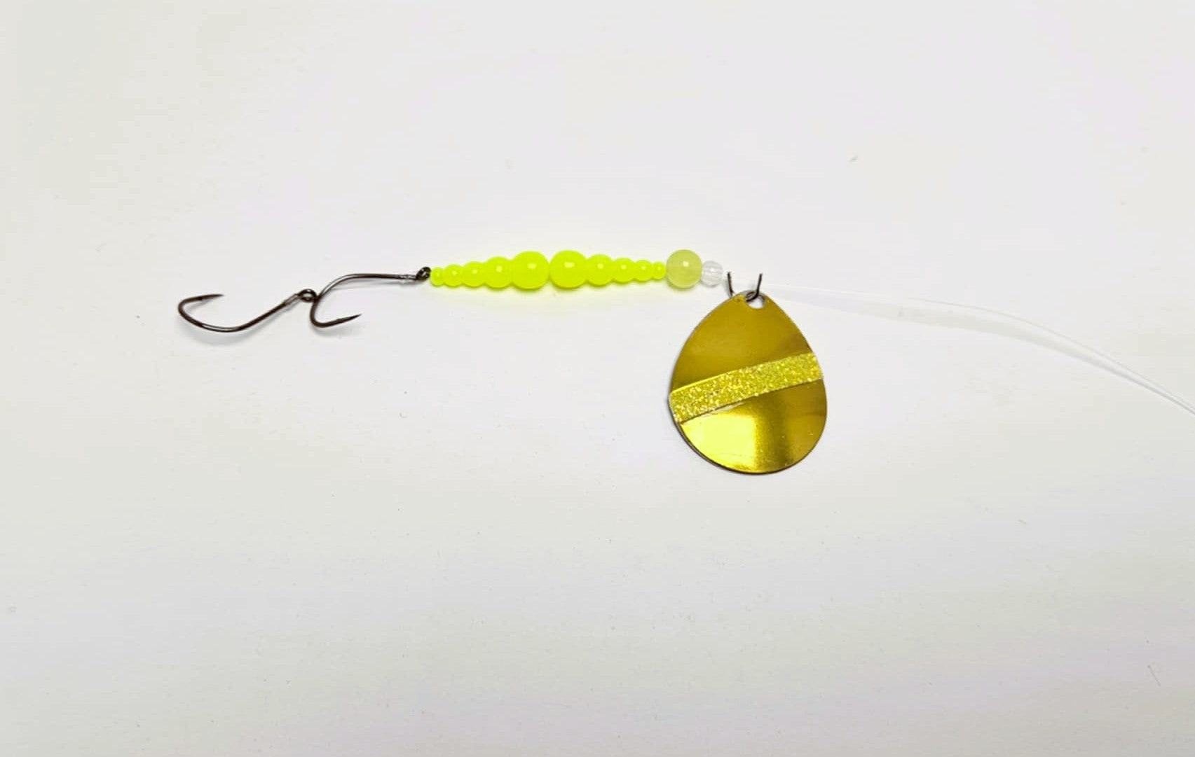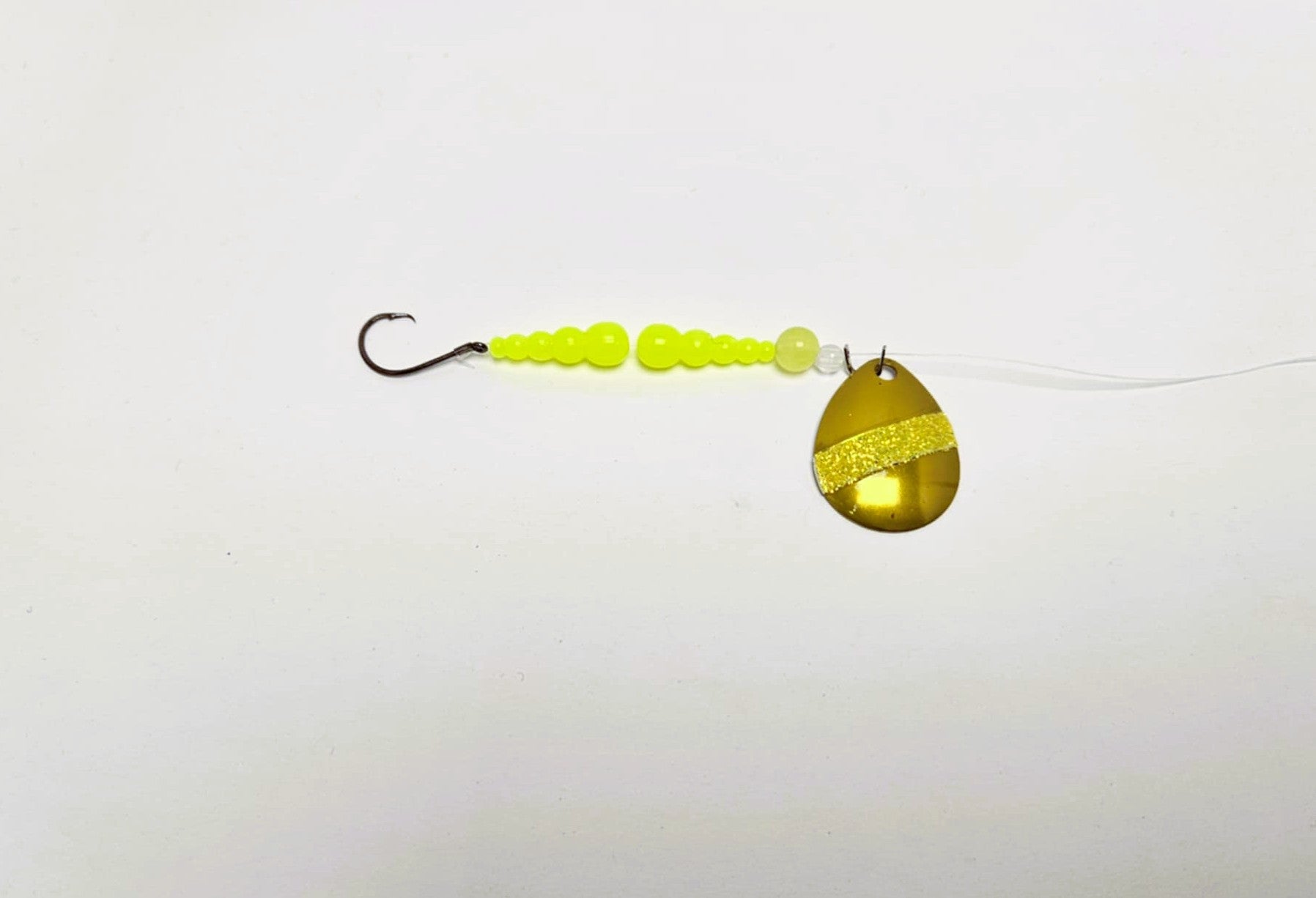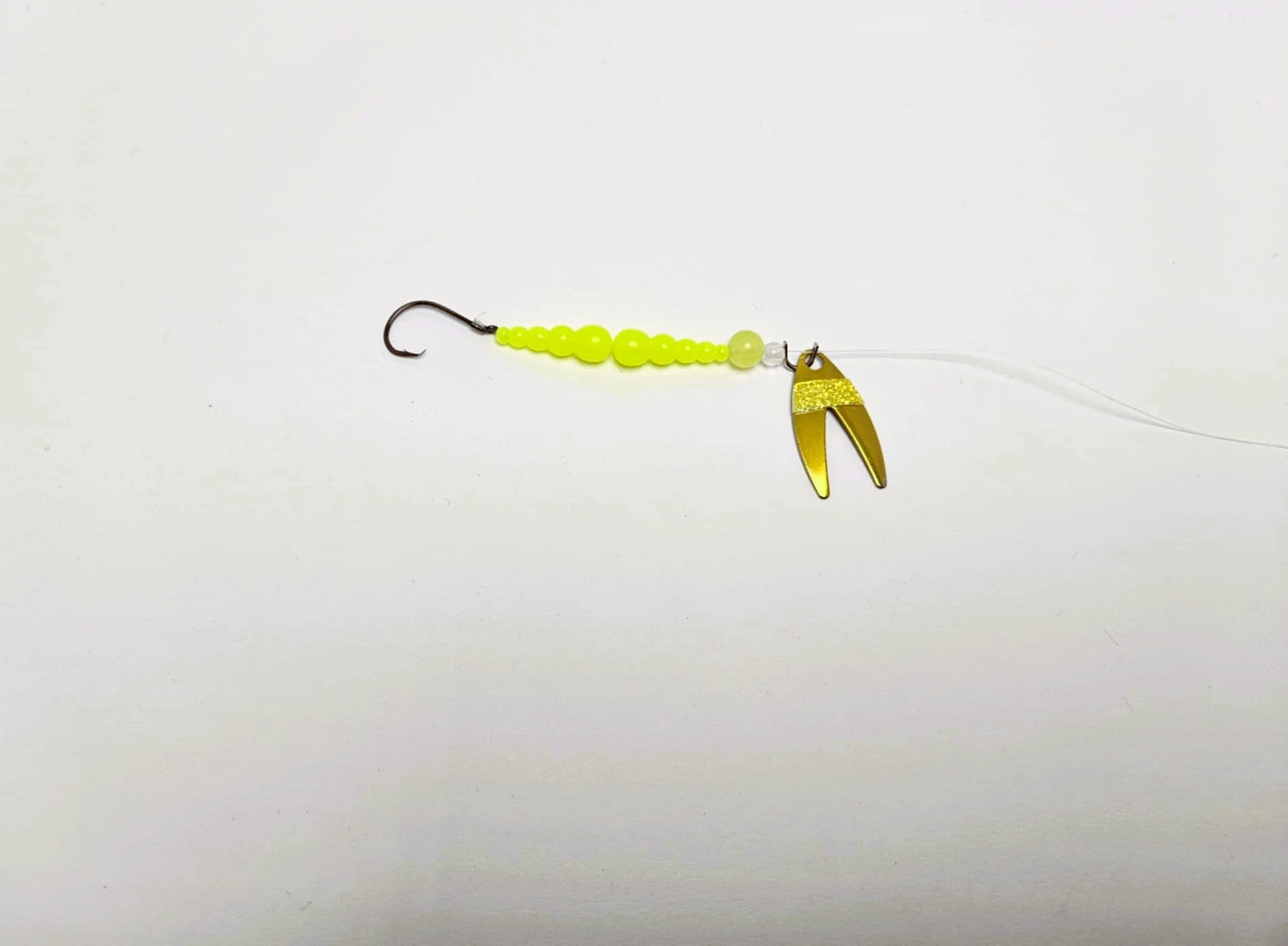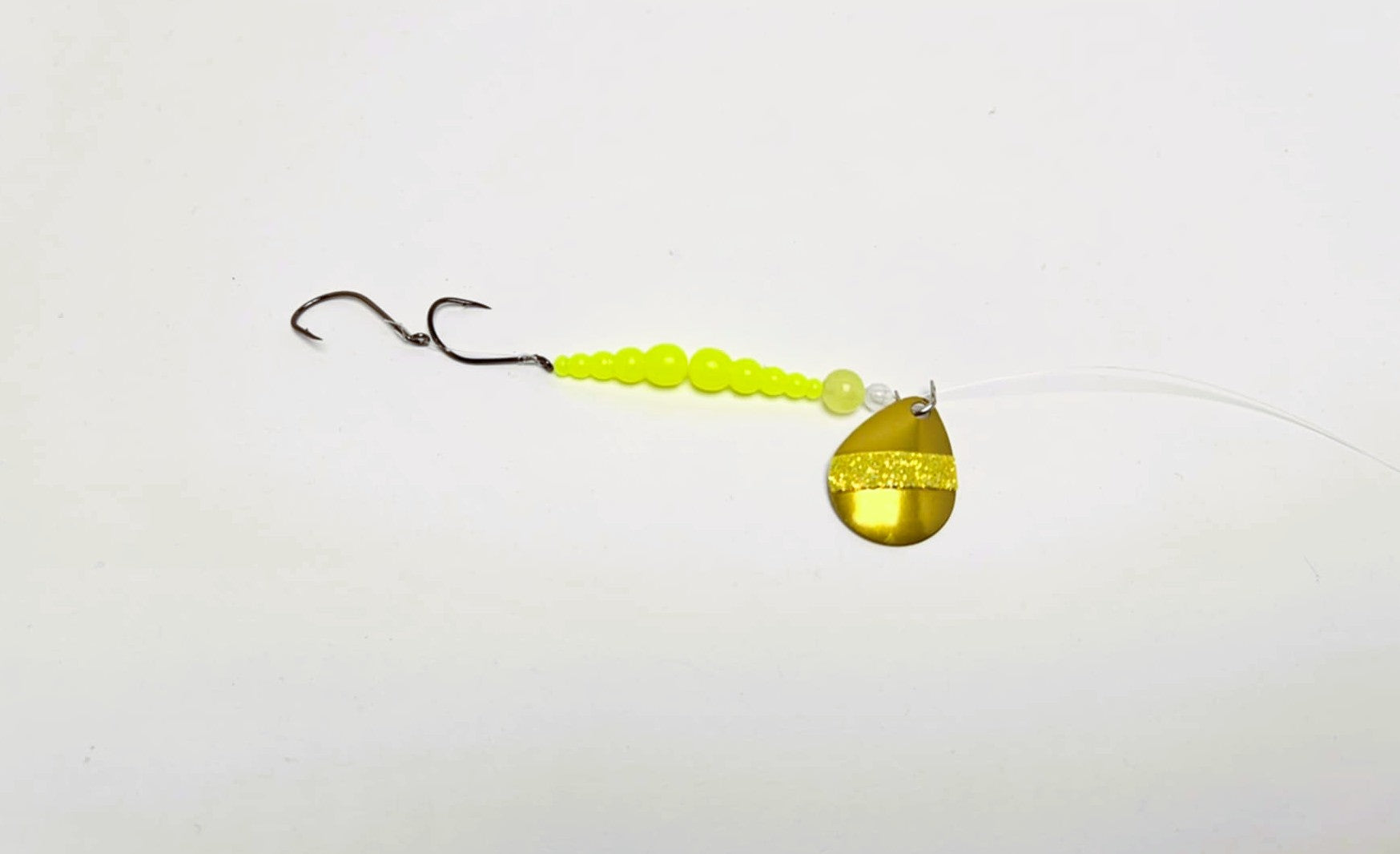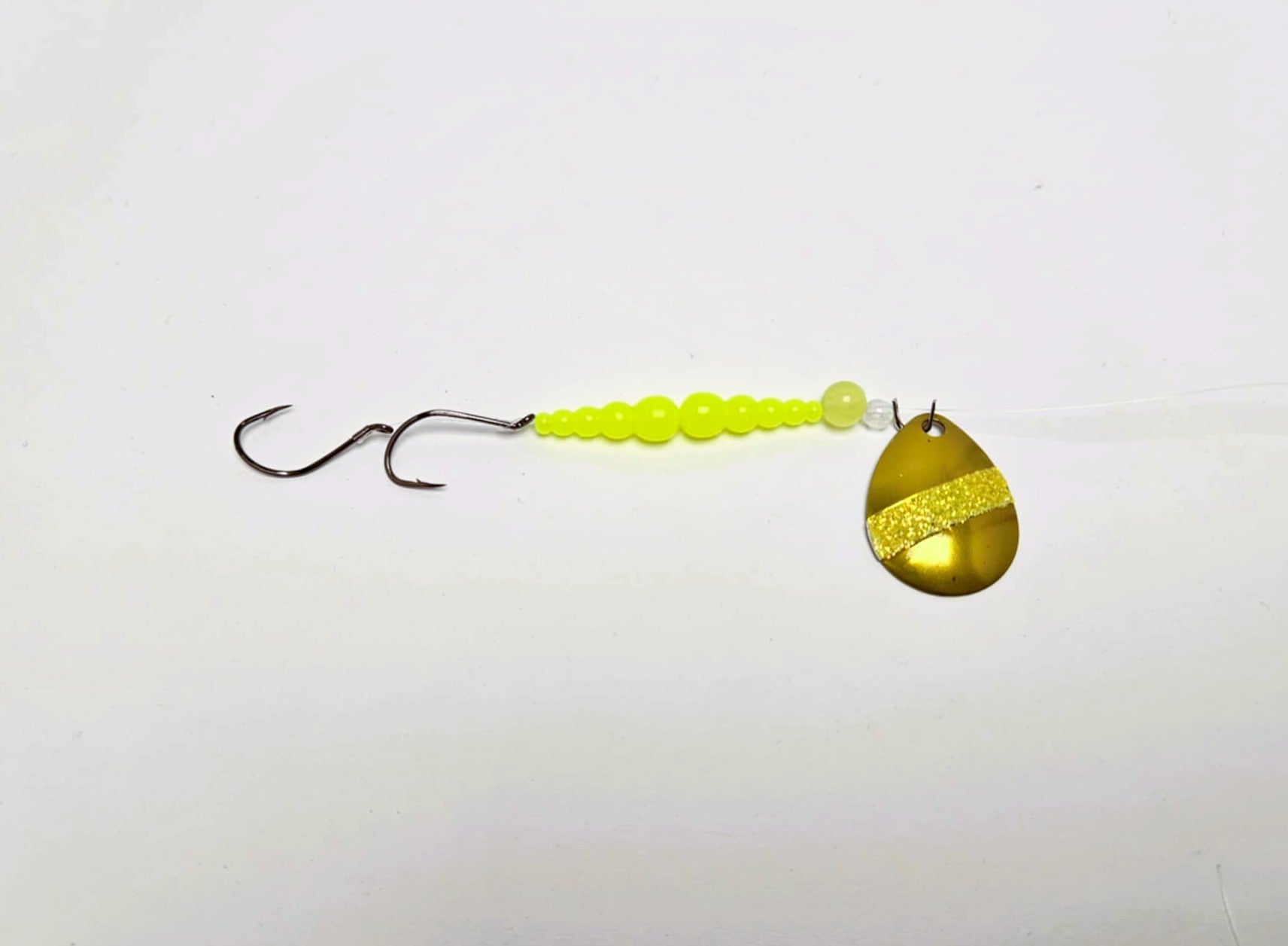 Comes Standard with UV Enhanced Hand Painted Blade and Hyper-Vis Tape, 8lb P-Line Leader, #4 Mustad Beak Hooks, UV Enhanced stack and single beads, and Glowing/UV Enhanced single beads.