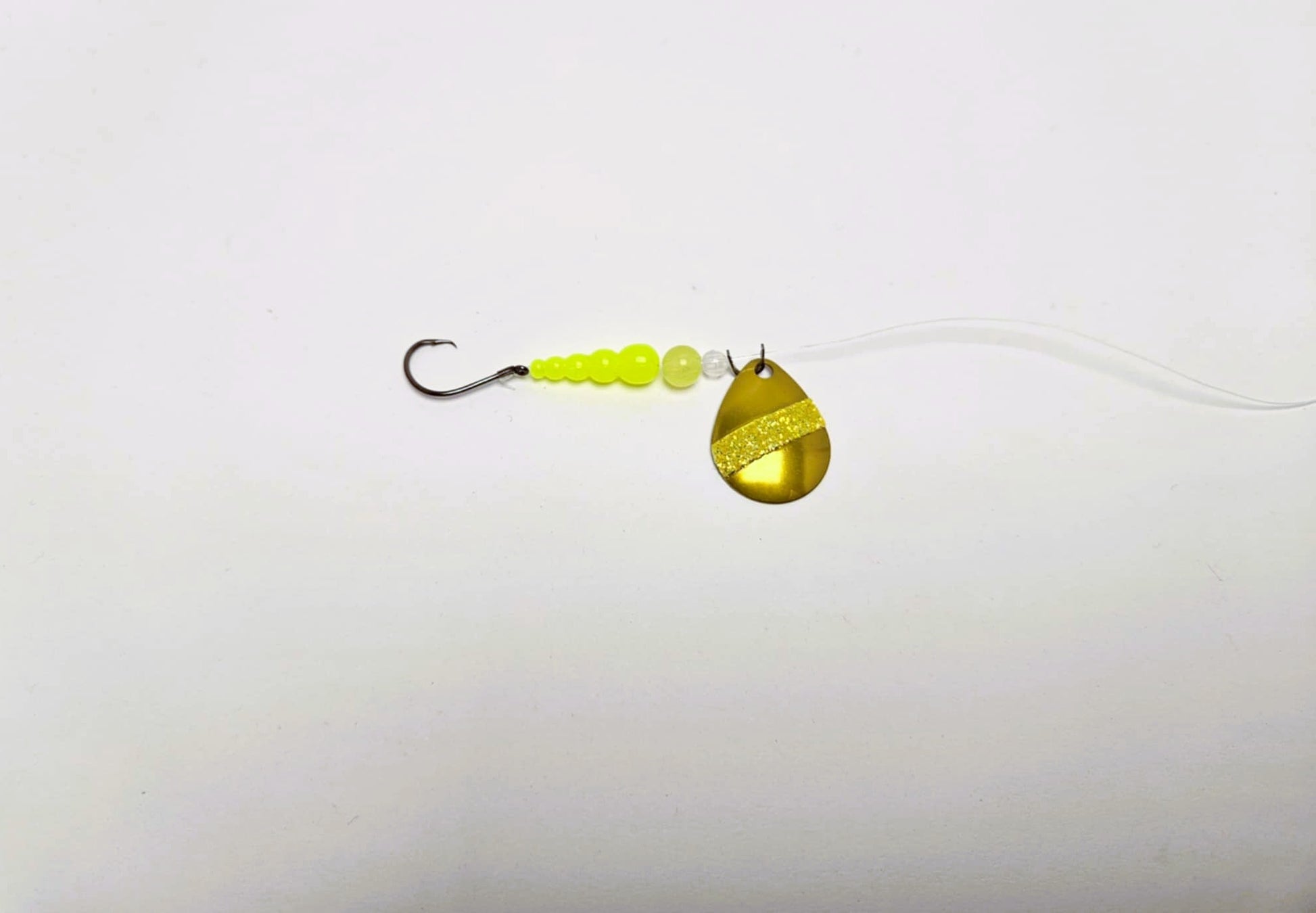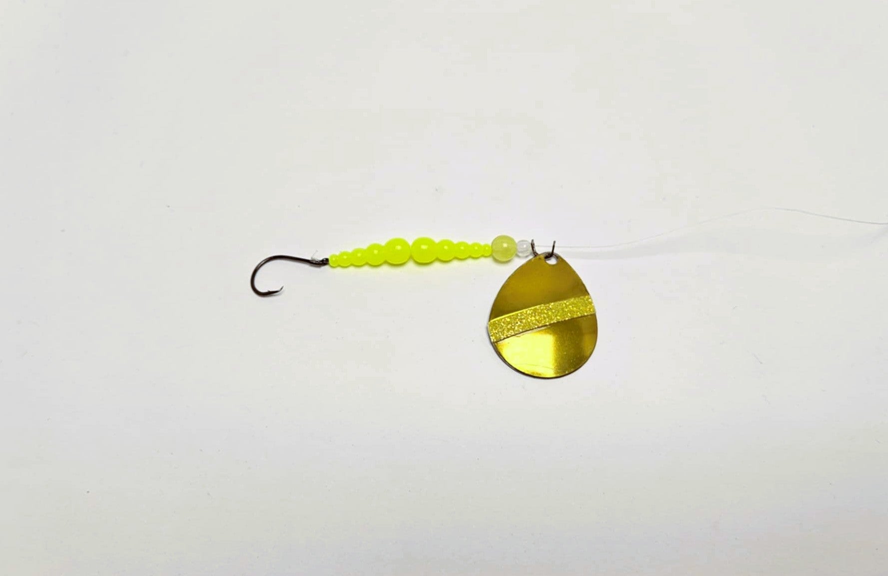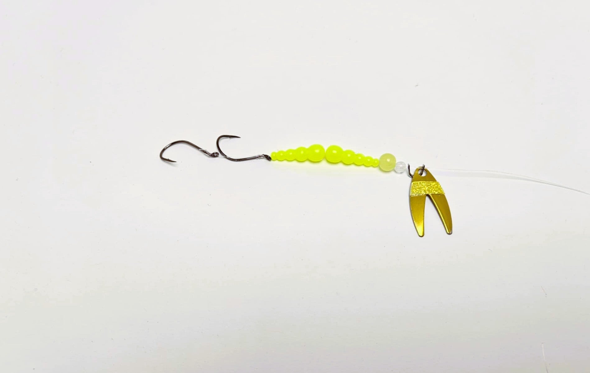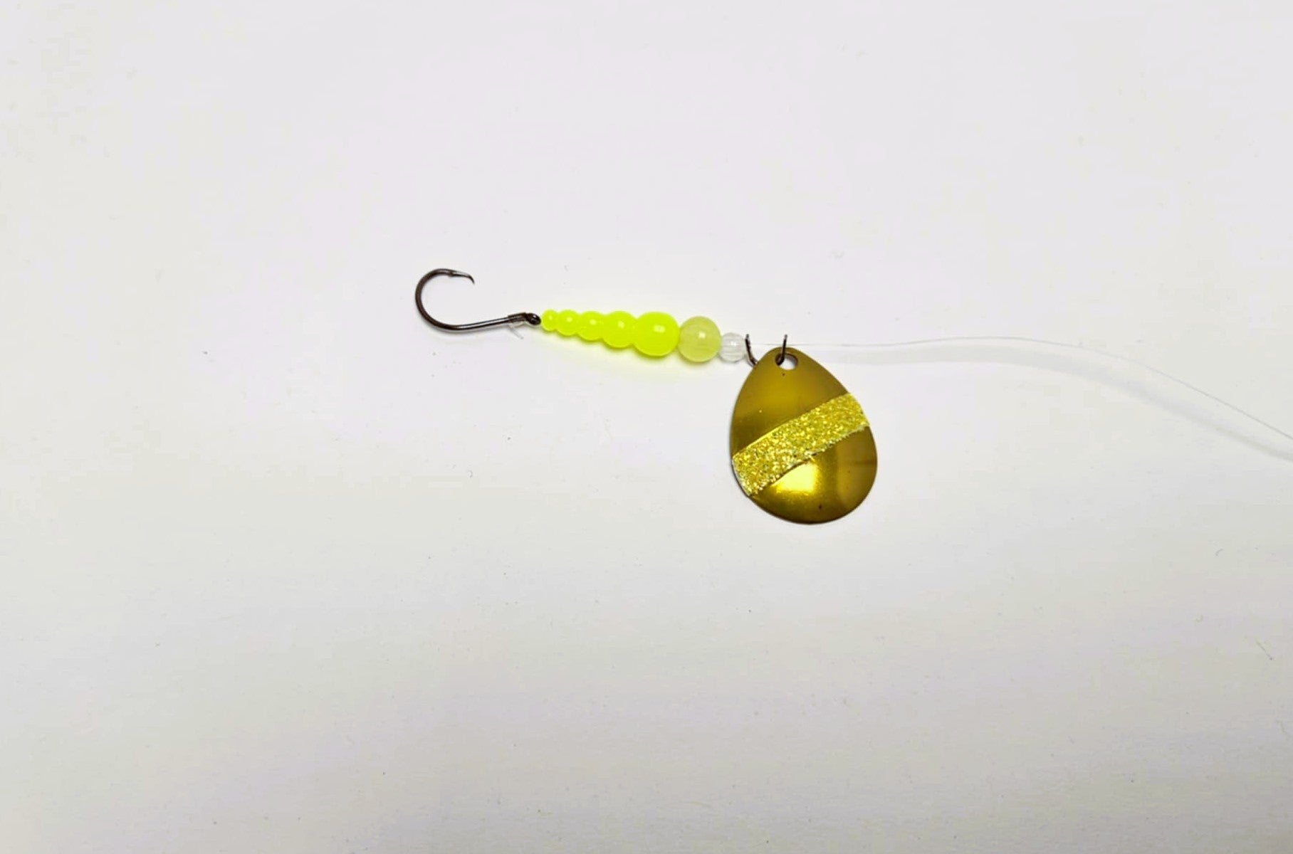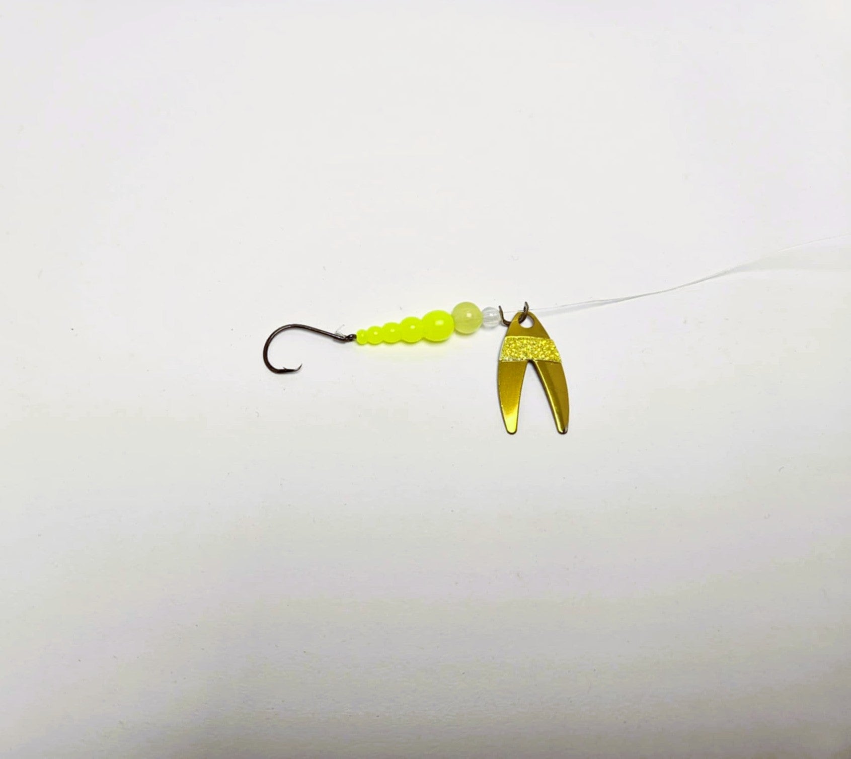 Comes Standard with UV Enhanced Hand Painted Blade and Hyper-Vis Tape, 8lb P-Line Leader, #4 Mustad Beak Hooks, UV Enhanced stack and single beads, and Glowing/UV Enhanced single beads.