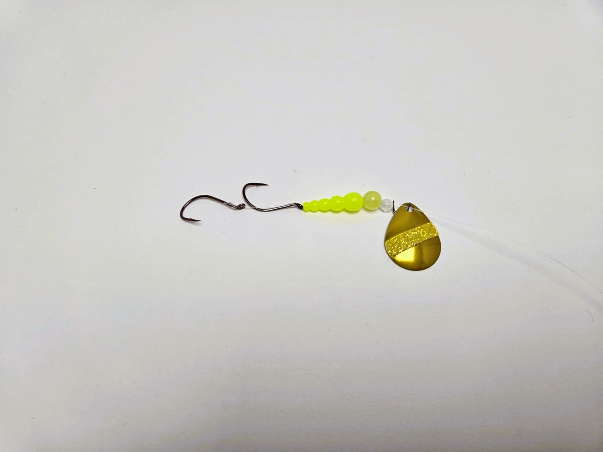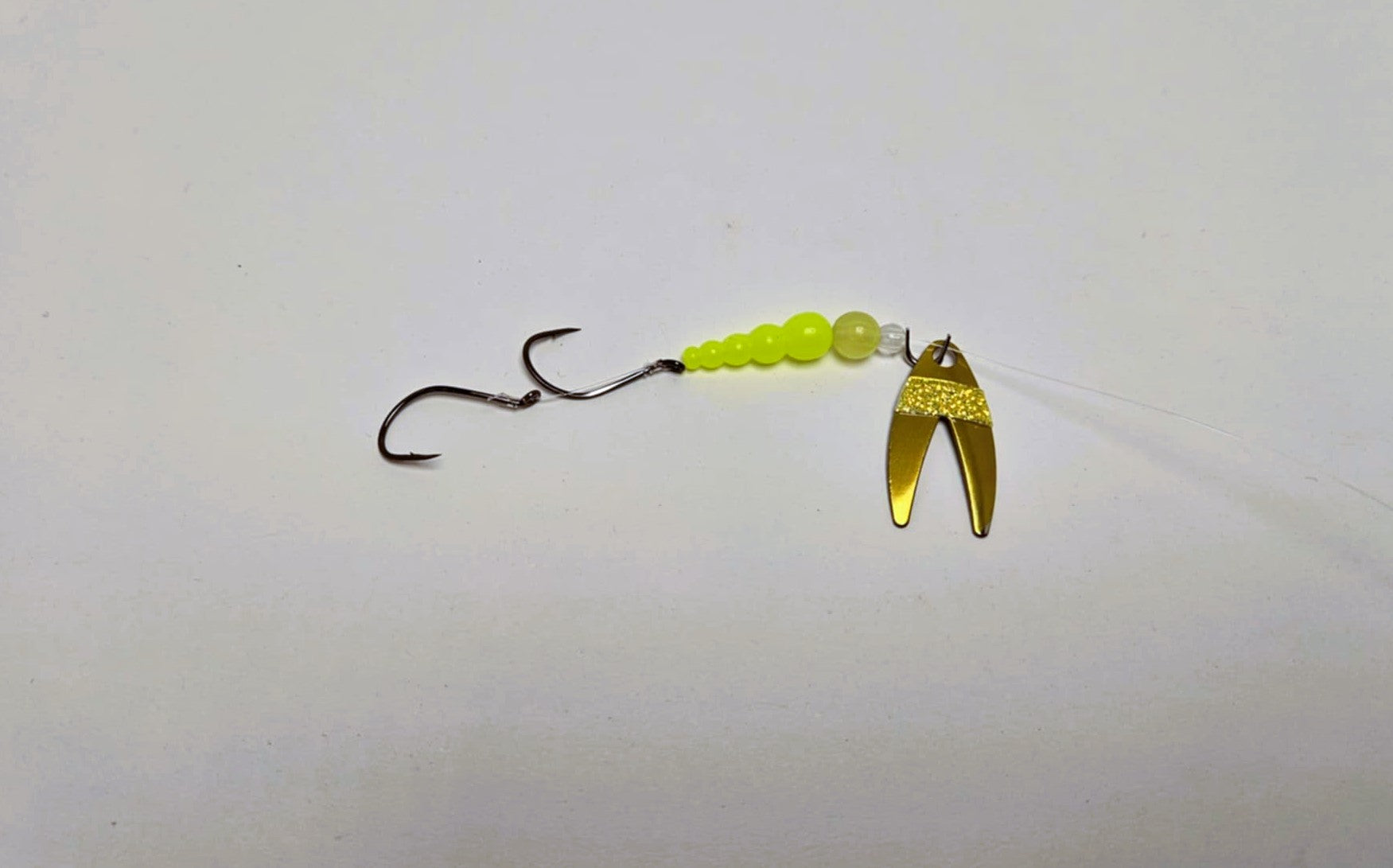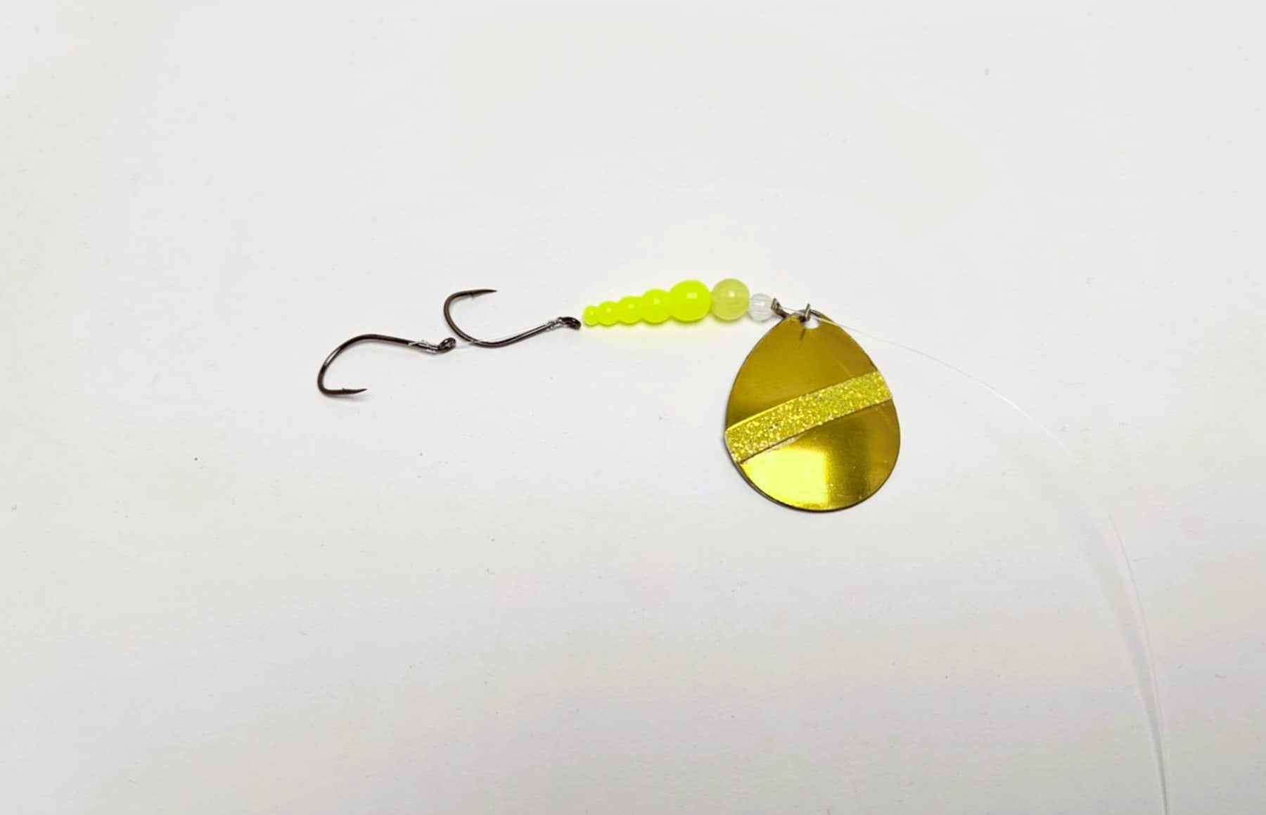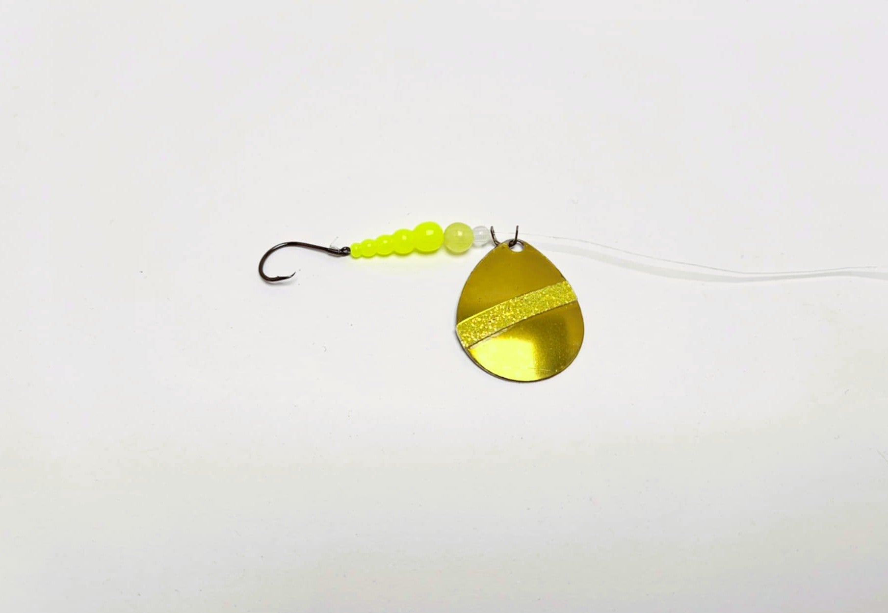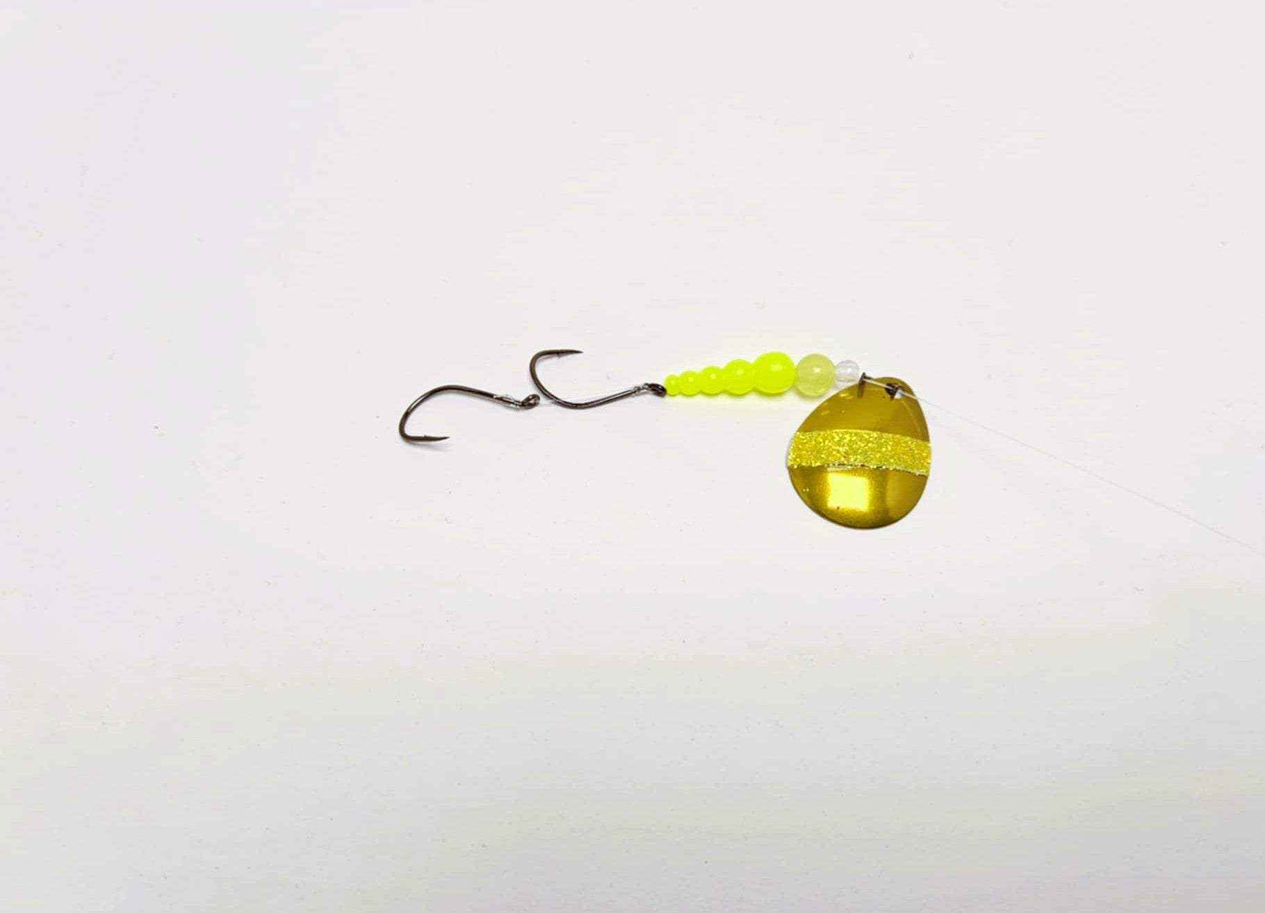 Comes Standard with UV Enhanced Hand Painted Blade and Hyper-Vis Tape, 8lb P-Line Leader, #4 Mustad Beak Hooks, UV Enhanced stack and single beads, and Glowing/UV Enhanced single beads.